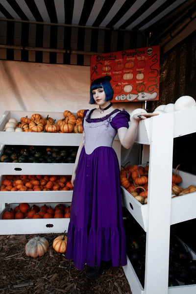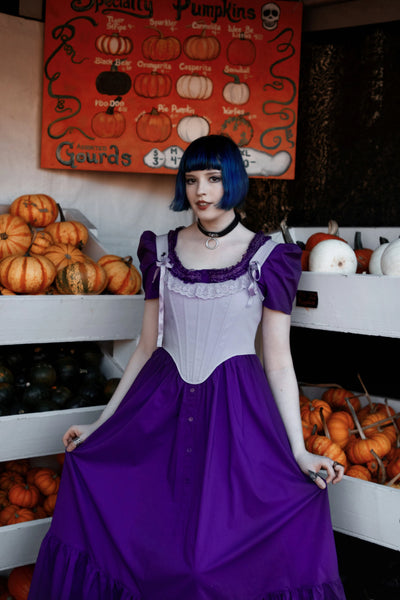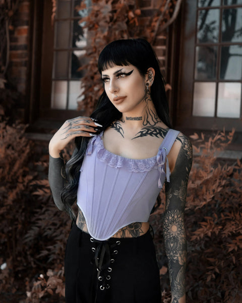 A beautiful lilac crop corset top with ribbon lace embellishments on the straps and a feminine lace trim. Easy to layer or wear alone.