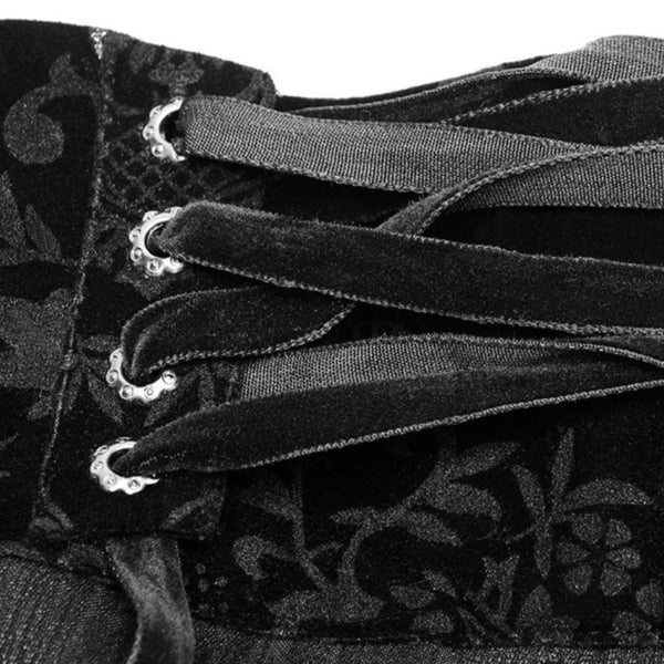 The flattering cumberbund-style waistband is made of a sensual velveteen fabric and features a beautiful floral pattern.