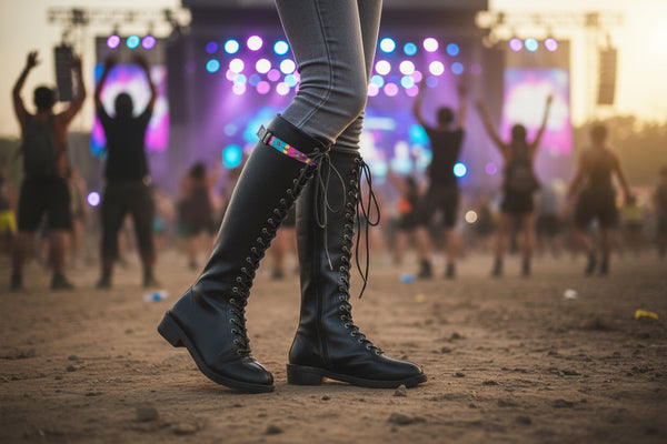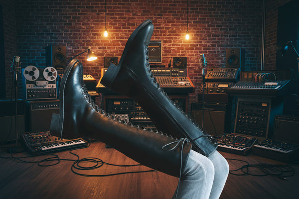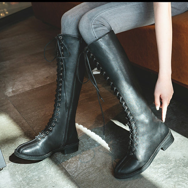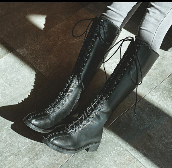Knee-high, flat heeled stomping combat boots, that lace up all the way to the top! These comfortable and stylish boots are perfect or gigs and festivals or daily alternative wear.