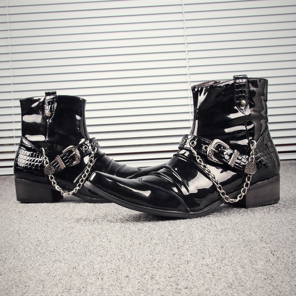 Shiny patent Gothic pike boots - the coolest traditional Goth men’s boots with a snakeskin-look heel, pointy toe, chain and buckled strap.