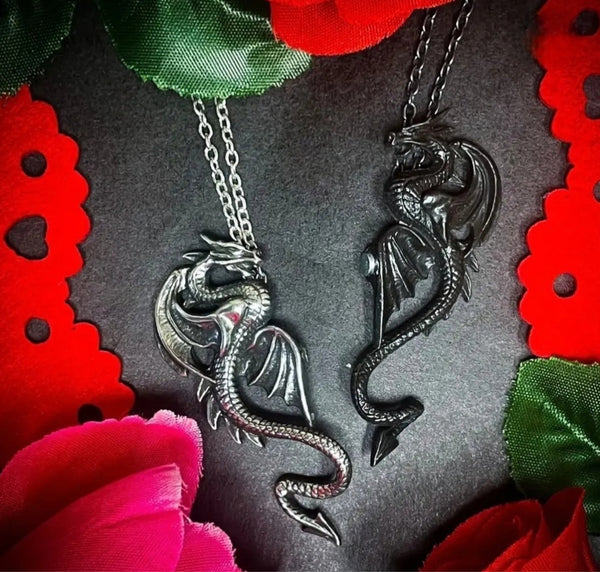 The two dragons are fastened together by hidden magnets and break apart when pulled, making two separate pendants on their own chains.