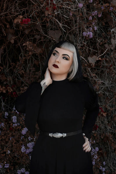 Featuring a custom-designed, ornate metal hand on black vegan leather.