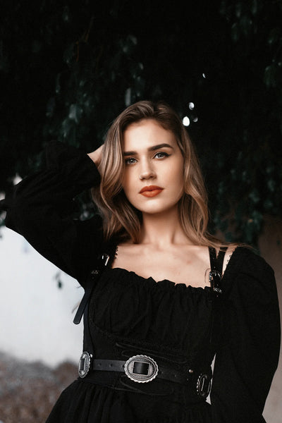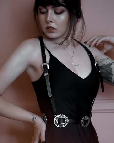 The ‘Mojave Poison’ Western Goth Conch Harness, an intricate conch buckled harness and a part of the Lively Ghosts Western Goth Series.