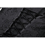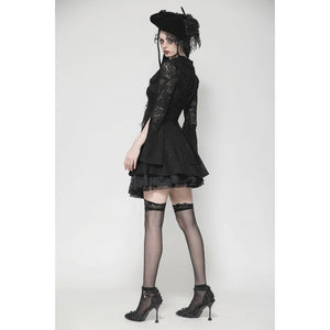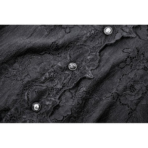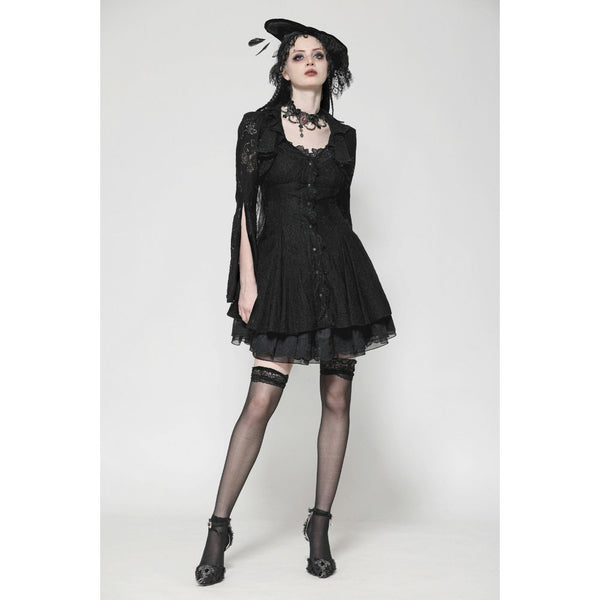 This classic "little black dress" features a floral lace fabric with an ornate buttoned front and ruffled, layered hems, delivering vampire glamor and style.
