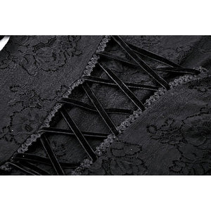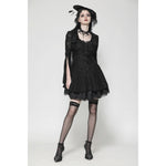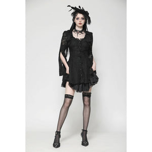 A trad goth mini dress with a beautiful corseted back piece, and stunning open bell sleeves.