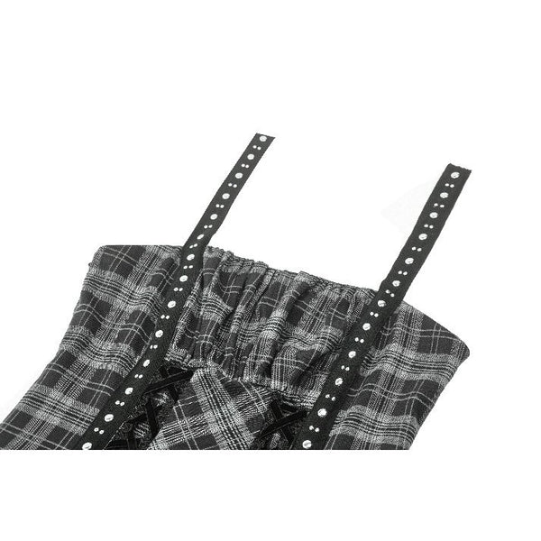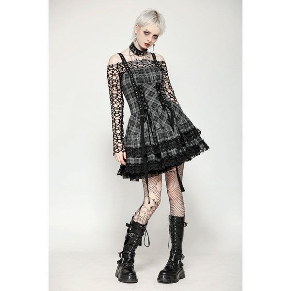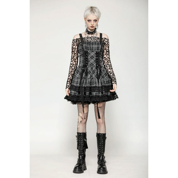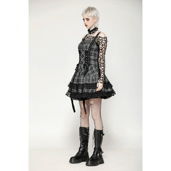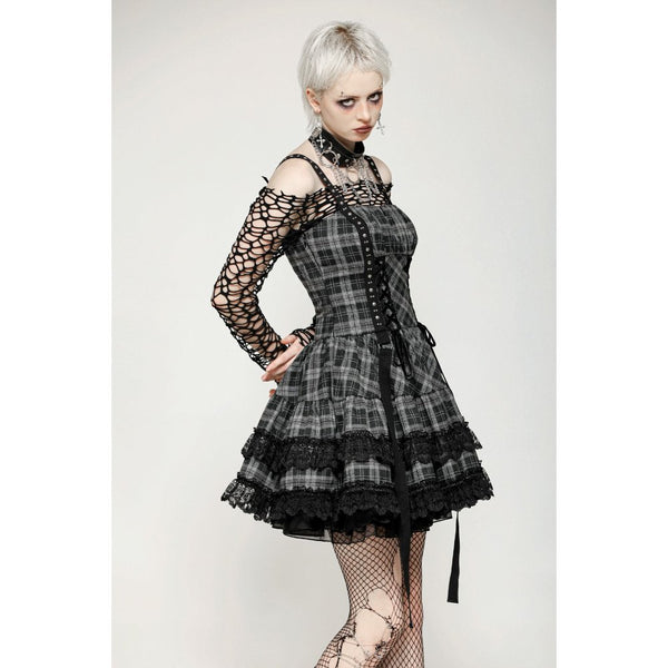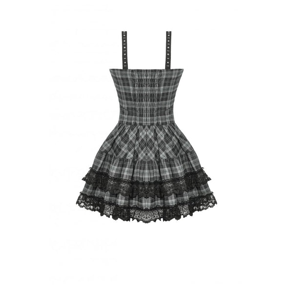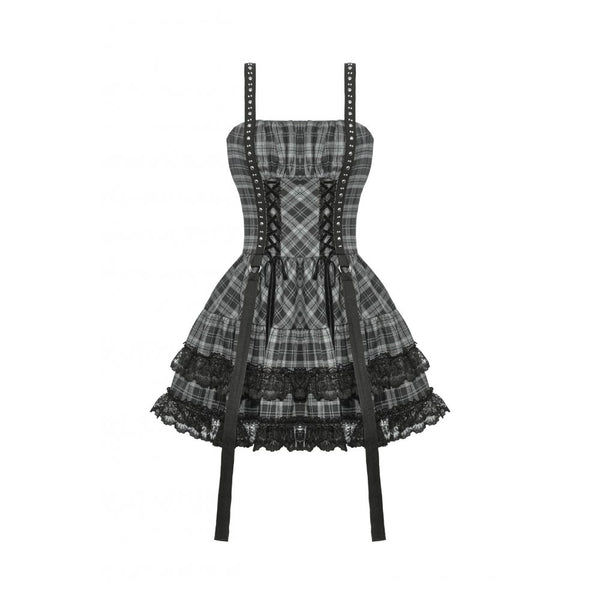 A striking grey plaid mini dress with studded straps and a ruffled creepy cute skirt with black lace hems.